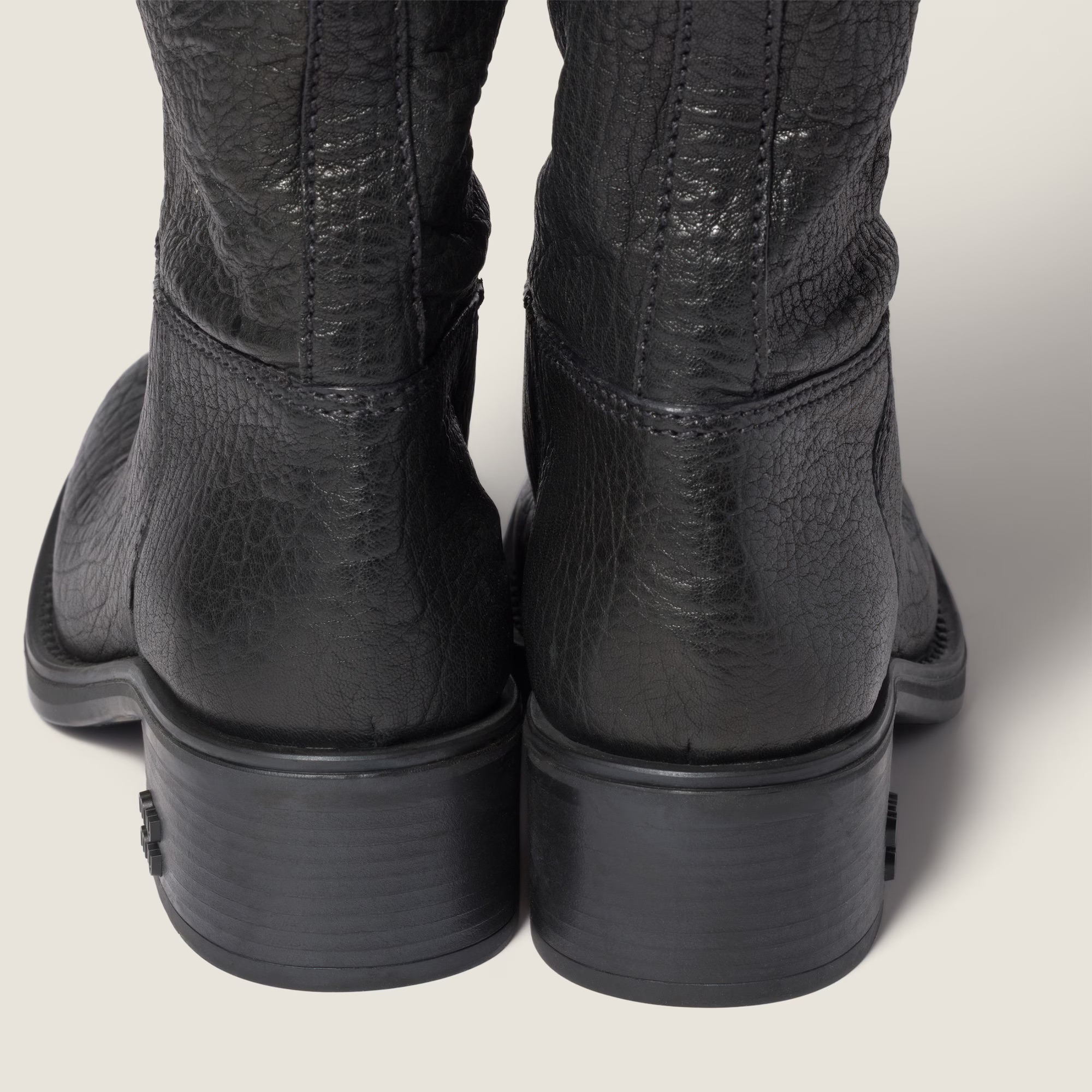 STIVALI IN PELLE COLLEZIONE 2026 PREZZO LISTINO 1650 EURO La grana strutturata e irregolare della nappa dona carattere e versatilità a questi stivali al ginocchio, dall’ispirazione combat e con punta leggermente squadrata che richiama i Miu Biker, rivelando un’attitudine audace e senza tempo. Codice articolo: 5W550E_3ZKF_F0002_F_050 Fodera in pelle Altezza Gambale: 39 cm Suola in gomma Tacco gomma con logo in metallo Altezza tacco: 50 mm Sottopiede in pelle Logo serigrafato taglia 38 Materiale principale: Pelle di agnello nuovi e mai indossati