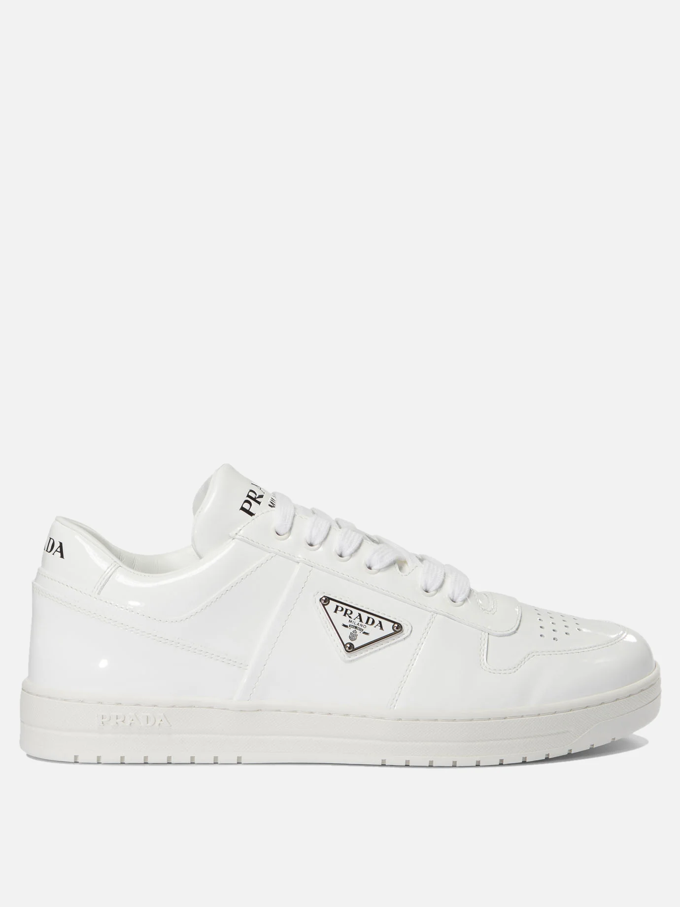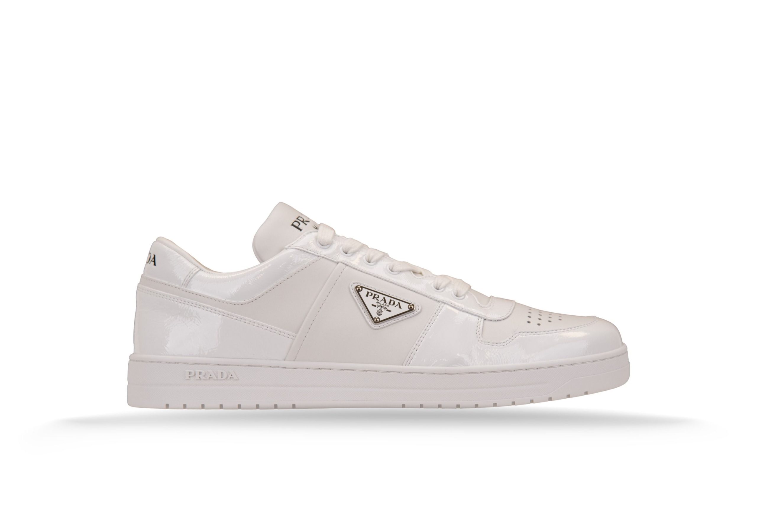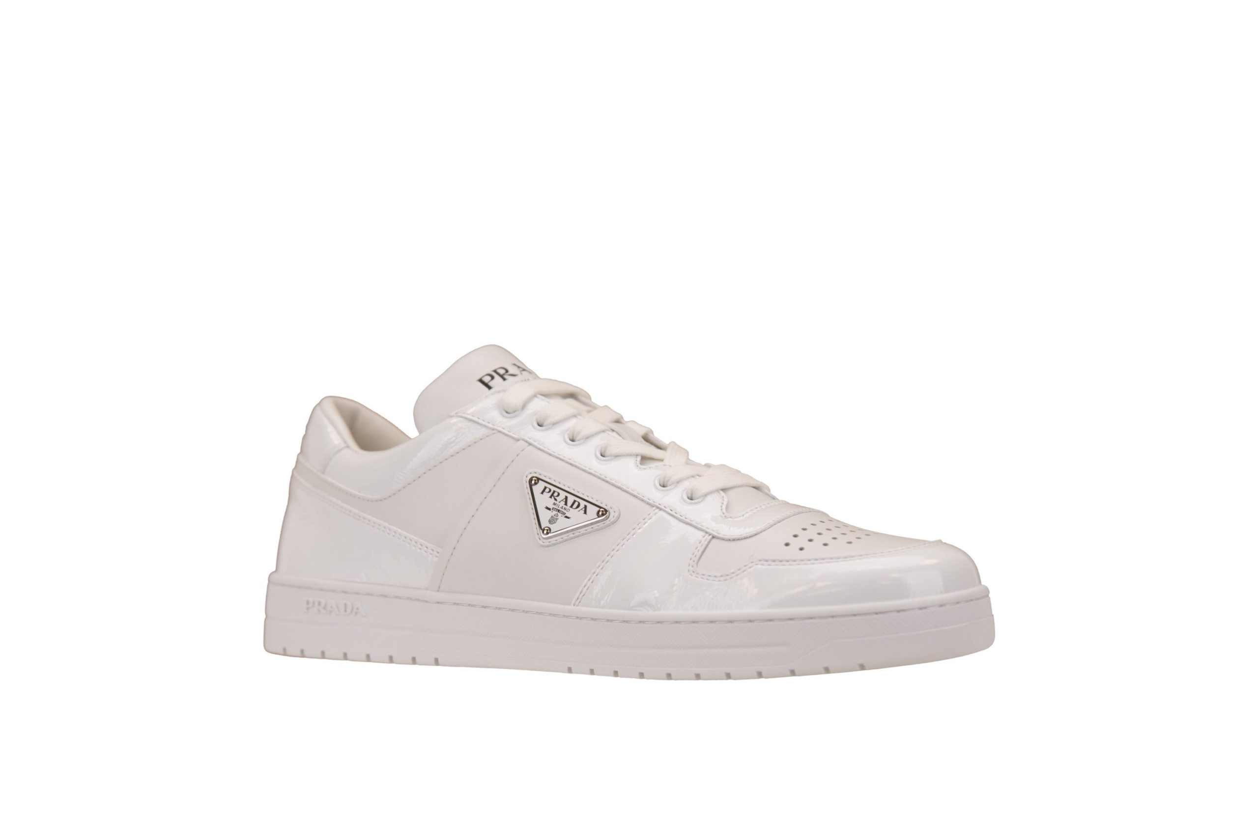 Sneakers da uomo firmate Prada. Tomaia realizzata in pelle con inserti in vitello naplak. Punta tonda, traforata. Interno foderato in tessuto, con parte centrale e posteriore realizzati in pelle. Soletta caratterizzata da scritta brand stampata a contrasto, removibile. Linguetta in pelle, imbottita, con parte esterna caratterizzata da scritta brand incisa. Presenta a lato hardware logato cucito. Suola in gomma, resistente. Made in Italy