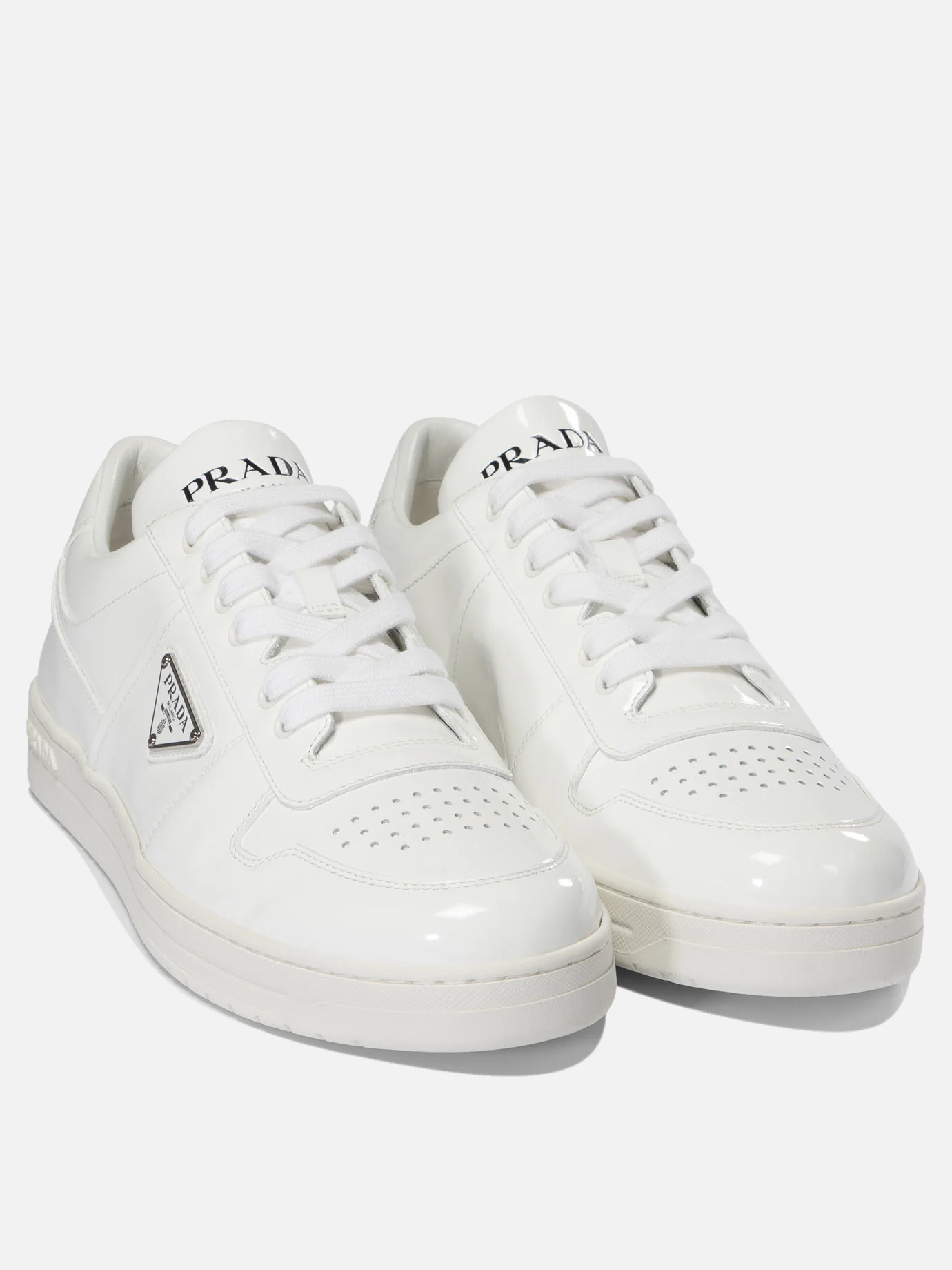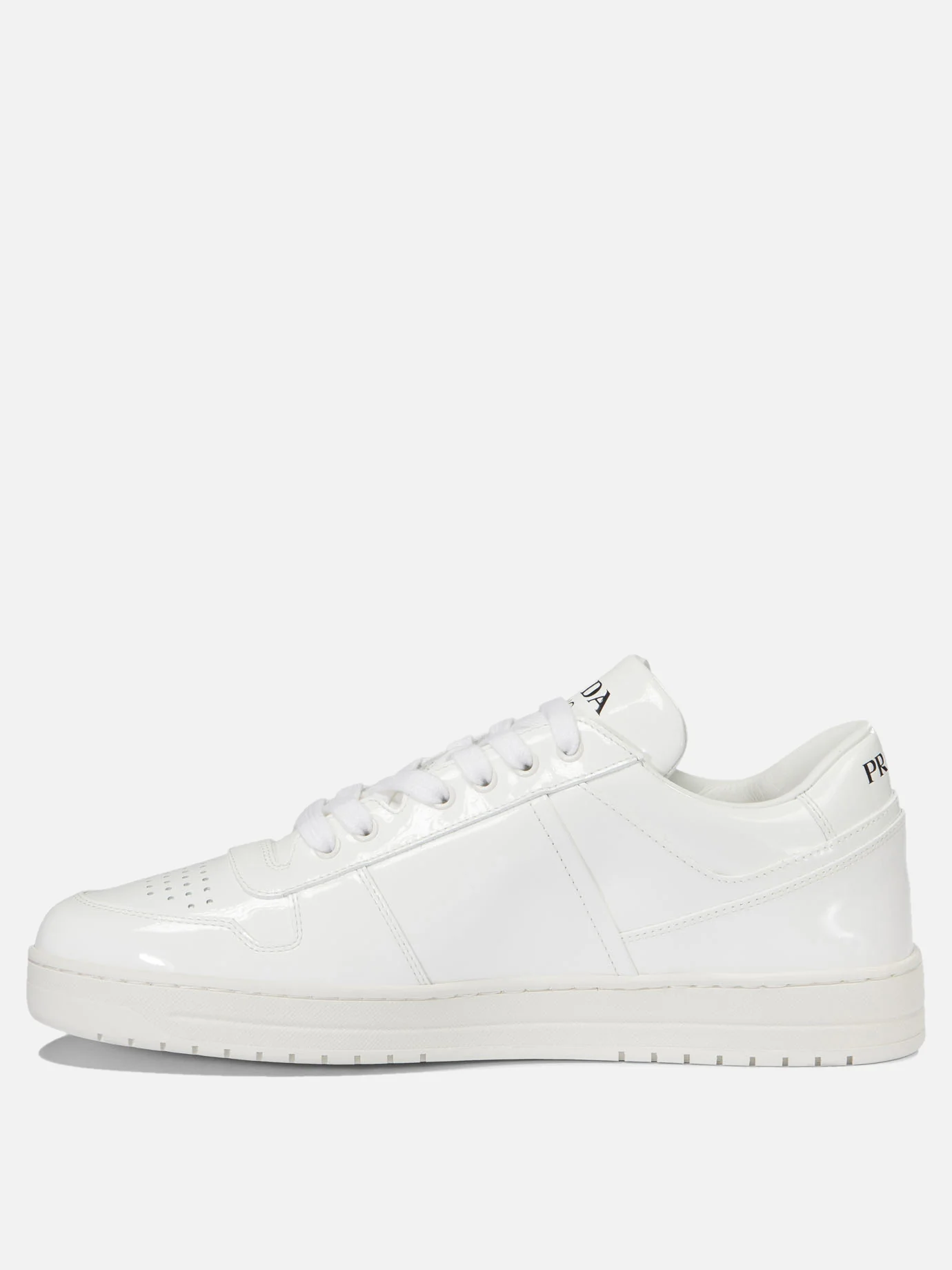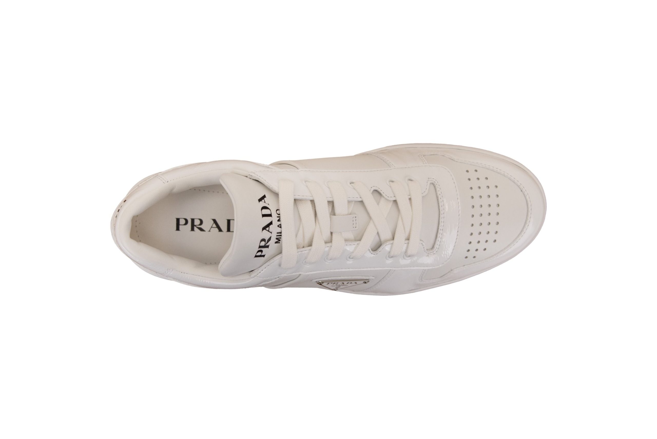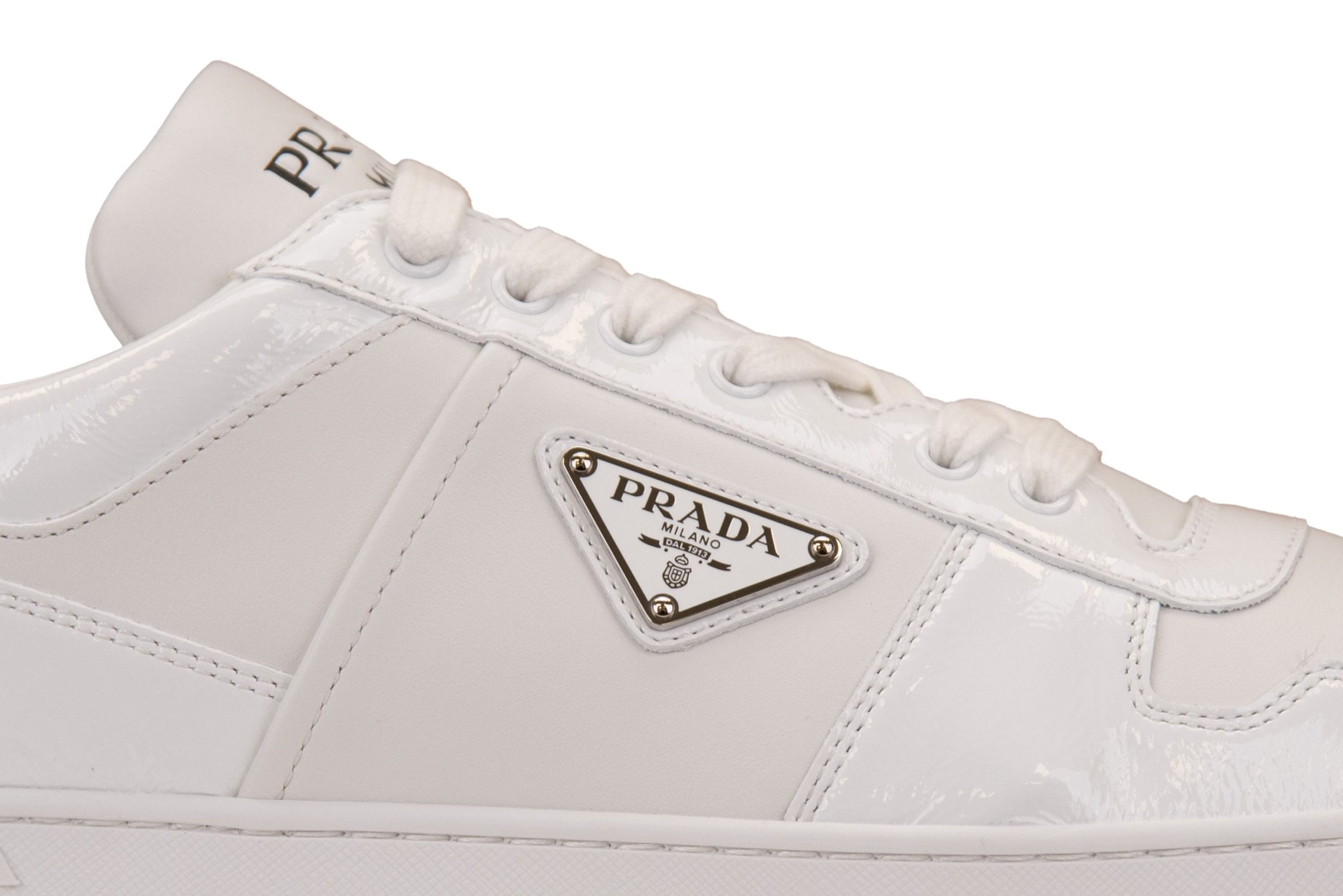 Sneakers da uomo firmate Prada. Tomaia realizzata in pelle con inserti in vitello naplak. Punta tonda, traforata. Interno foderato in tessuto, con parte centrale e posteriore realizzati in pelle. Soletta caratterizzata da scritta brand stampata a contrasto, removibile. Linguetta in pelle, imbottita, con parte esterna caratterizzata da scritta brand incisa. Presenta a lato hardware logato cucito. Suola in gomma, resistente. Made in Italy